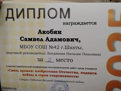 Учащийся 10 класса Акобян Самвел занял третье место в научной конференции «Связь времени: изобретения Отечества, подвиги и герои современности»!